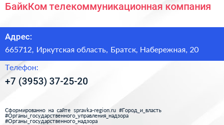 БайкКом, телекоммуникационная компания по адресу 665712, Иркутская область, Братск, Набережная, 20 в дальнейшем Организация, размещена в следующих категориях: