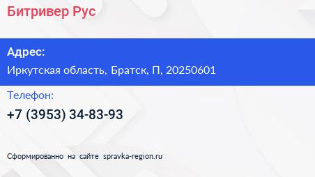 Битривер Рус по адресу Иркутская область, Братск, П, 20250601 в дальнейшем Организация, размещена в следующих категориях: