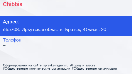 Chibbis по адресу 665708, Иркутская область, Братск, Южная, 20 в дальнейшем Организация, размещена в следующих категориях: