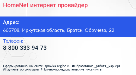 HomeNet, интернет-провайдер по адресу 665708, Иркутская область, Братск, Обручева, 22 в дальнейшем Организация, размещена в следующих категориях: