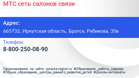 МТС, сеть салонов связи по адресу 665732, Иркутская область, Братск, Рябикова, 35в в дальнейшем Организация, размещена в следующих категориях: