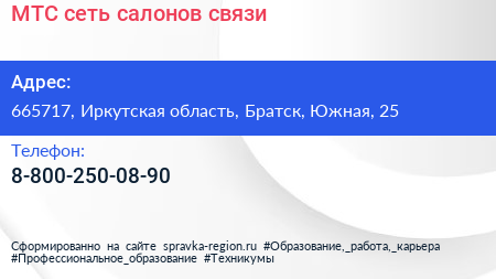 МТС, сеть салонов связи по адресу 665717, Иркутская область, Братск, Южная, 25 в дальнейшем Организация, размещена в следующих категориях: