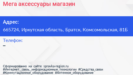 Мега аксессуары, магазин по адресу 665724, Иркутская область, Братск, Комсомольская, 81Б в дальнейшем Организация, размещена в следующих категориях: