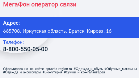 МегаФон, оператор связи по адресу 665708, Иркутская область, Братск, Кирова, 16 в дальнейшем Организация, размещена в следующих категориях: