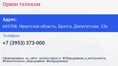 Орион телеком по адресу 665708, Иркутская область, Братск, Депутатская, 13а в дальнейшем Организация, размещена в следующих категориях:
