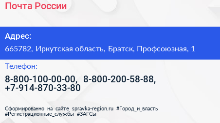 Почта России по адресу 665782, Иркутская область, Братск, Профсоюзная, 1 в дальнейшем Организация, размещена в следующих категориях: