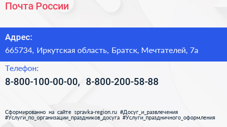 Почта России по адресу 665734, Иркутская область, Братск, Мечтателей, 7а в дальнейшем Организация, размещена в следующих категориях: