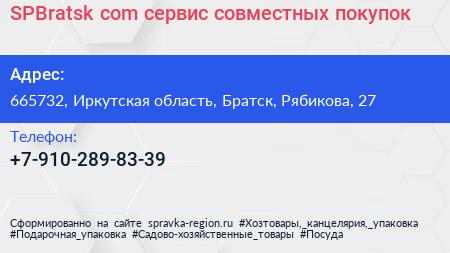 SPBratsk.com, сервис совместных покупок по адресу 665732, Иркутская область, Братск, Рябикова, 27 в дальнейшем Организация, размещена в следующих категориях: