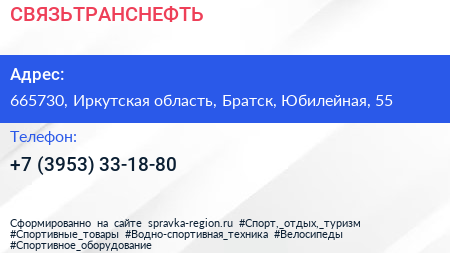 СВЯЗЬТРАНСНЕФТЬ по адресу 665730, Иркутская область, Братск, Юбилейная, 55 в дальнейшем Организация, размещена в следующих категориях: