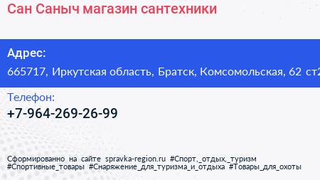 Сан Саныч, магазин сантехники по адресу 665717, Иркутская область, Братск, Комсомольская, 62 ст2 в дальнейшем Организация, размещена в следующих категориях: