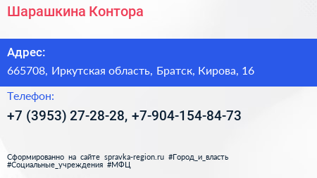 Шарашкина Контора по адресу 665708, Иркутская область, Братск, Кирова, 16 в дальнейшем Организация, размещена в следующих категориях: