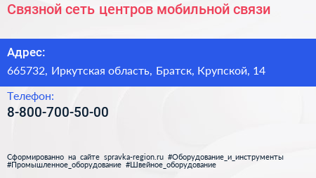 Связной, сеть центров мобильной связи по адресу 665732, Иркутская область, Братск, Крупской, 14 в дальнейшем Организация, размещена в следующих категориях: