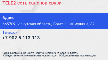 TELE2, сеть салонов связи по адресу 665709, Иркутская область, Братск, Наймушина, 32 в дальнейшем Организация, размещена в следующих категориях: