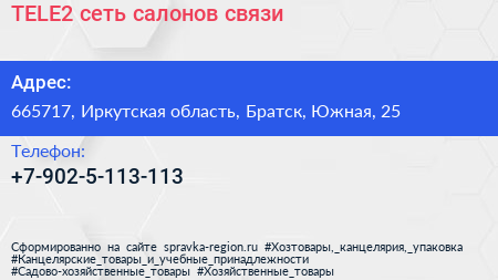 TELE2, сеть салонов связи по адресу 665717, Иркутская область, Братск, Южная, 25 в дальнейшем Организация, размещена в следующих категориях: