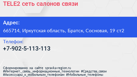 TELE2, сеть салонов связи по адресу 665714, Иркутская область, Братск, Сосновая, 19 ст2 в дальнейшем Организация, размещена в следующих категориях:
