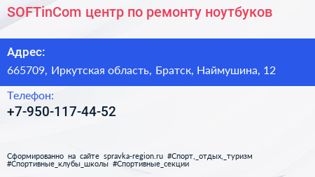 SOFTinCom, центр по ремонту ноутбуков по адресу 665709, Иркутская область, Братск, Наймушина, 12 в дальнейшем Организация, размещена в следующих категориях: