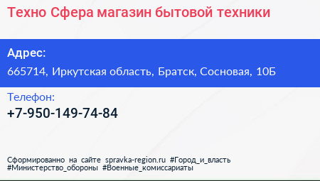 Техно Сфера, магазин бытовой техники по адресу 665714, Иркутская область, Братск, Сосновая, 10Б в дальнейшем Организация, размещена в следующих категориях: