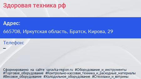 Здоровая-техника.рф по адресу 665708, Иркутская область, Братск, Кирова, 29 в дальнейшем Организация, размещена в следующих категориях: