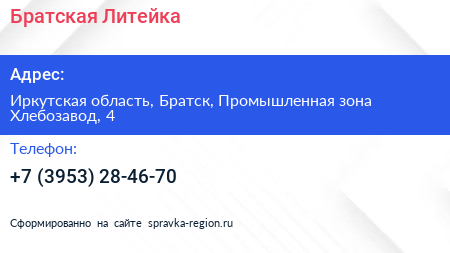 Братская Литейка по адресу Иркутская область, Братск, Промышленная зона Хлебозавод, 4 в дальнейшем Организация, размещена в следующих категориях:
