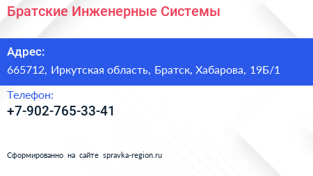 Братские Инженерные Системы по адресу 665712, Иркутская область, Братск, Хабарова, 19Б/1 в дальнейшем Организация, размещена в следующих категориях: