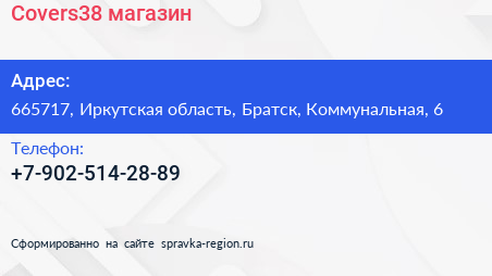 Covers38, магазин по адресу 665717, Иркутская область, Братск, Коммунальная, 6 в дальнейшем Организация, размещена в следующих категориях: