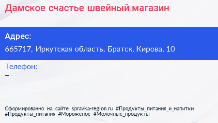 Дамское счастье, швейный магазин по адресу 665717, Иркутская область, Братск, Кирова, 10 в дальнейшем Организация, размещена в следующих категориях: