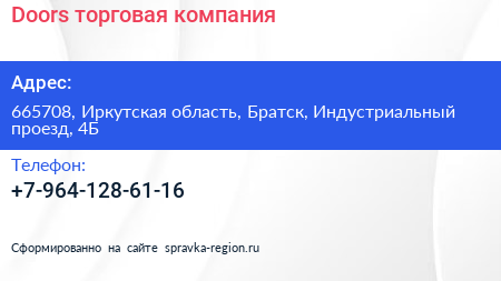 Doors, торговая компания по адресу 665708, Иркутская область, Братск, Индустриальный проезд, 4Б в дальнейшем Организация, размещена в следующих категориях: