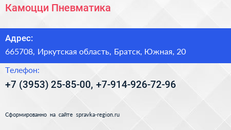 Камоцци Пневматика по адресу 665708, Иркутская область, Братск, Южная, 20 в дальнейшем Организация, размещена в следующих категориях: