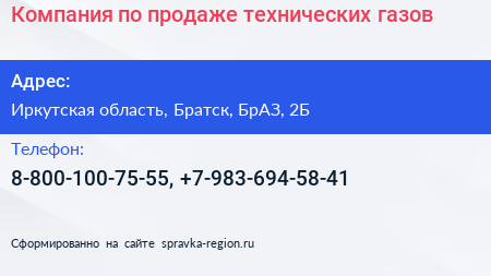 Компания по продаже технических газов по адресу Иркутская область, Братск, БрАЗ, 2Б в дальнейшем Организация, размещена в следующих категориях: