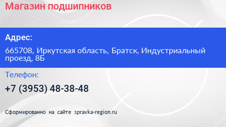 Магазин подшипников по адресу 665708, Иркутская область, Братск, Индустриальный проезд, 8Б в дальнейшем Организация, размещена в следующих категориях: