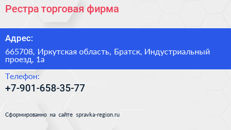 Рестра, торговая фирма по адресу 665708, Иркутская область, Братск, Индустриальный проезд, 1а в дальнейшем Организация, размещена в следующих категориях: