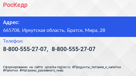 РосКедр по адресу 665708, Иркутская область, Братск, Мира, 28 в дальнейшем Организация, размещена в следующих категориях: