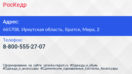 РосКедр по адресу 665708, Иркутская область, Братск, Мира, 2 в дальнейшем Организация, размещена в следующих категориях:
