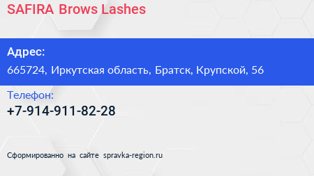 SAFIRA Brows & Lashes по адресу 665724, Иркутская область, Братск, Крупской, 56 в дальнейшем Организация, размещена в следующих категориях: