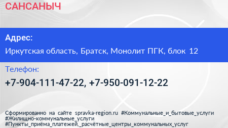 САНСАНЫЧ по адресу Иркутская область, Братск, Монолит ПГК, блок 12 в дальнейшем Организация, размещена в следующих категориях: