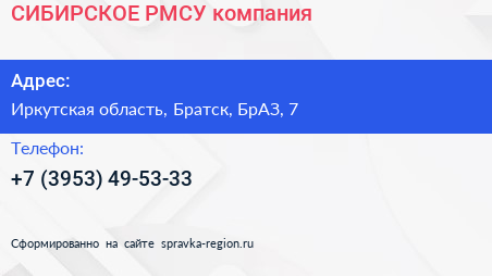 СИБИРСКОЕ РМСУ, компания по адресу Иркутская область, Братск, БрАЗ, 7 в дальнейшем Организация, размещена в следующих категориях: