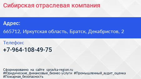 Сибирская отраслевая компания по адресу 665712, Иркутская область, Братск, Декабристов, 2 в дальнейшем Организация, размещена в следующих категориях: