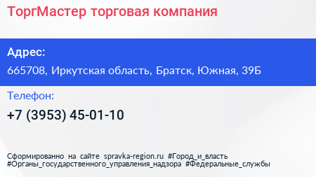 ТоргМастер, торговая компания по адресу 665708, Иркутская область, Братск, Южная, 39Б в дальнейшем Организация, размещена в следующих категориях: