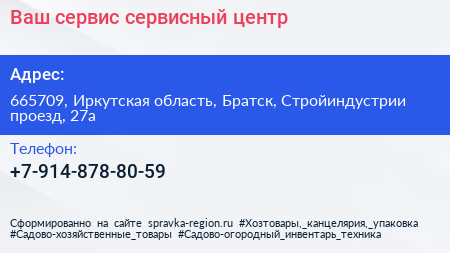 Ваш сервис, сервисный центр по адресу 665709, Иркутская область, Братск, Стройиндустрии проезд, 27а в дальнейшем Организация, размещена в следующих категориях: