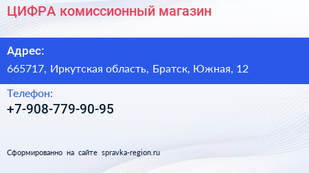 ЦИФРА, комиссионный магазин по адресу 665717, Иркутская область, Братск, Южная, 12 в дальнейшем Организация, размещена в следующих категориях: