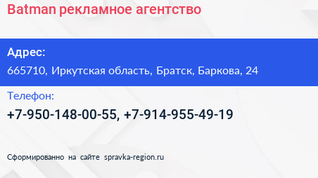 Batman, рекламное агентство по адресу 665710, Иркутская область, Братск, Баркова, 24 в дальнейшем Организация, размещена в следующих категориях: