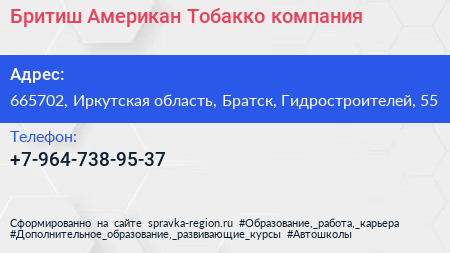 Бритиш Американ Тобакко, компания по адресу 665702, Иркутская область, Братск, Гидростроителей, 55 в дальнейшем Организация, размещена в следующих категориях: