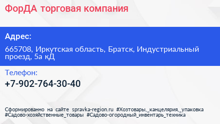 ФорДА, торговая компания по адресу 665708, Иркутская область, Братск, Индустриальный проезд, 5а кД в дальнейшем Организация, размещена в следующих категориях: