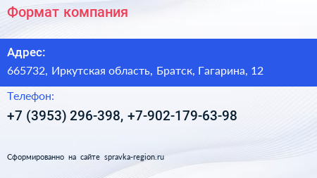 Формат, компания по адресу 665732, Иркутская область, Братск, Гагарина, 12 в дальнейшем Организация, размещена в следующих категориях: