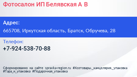 Фотосалон, ИП Белявская А.В. по адресу 665708, Иркутская область, Братск, Обручева, 28 в дальнейшем Организация, размещена в следующих категориях:
