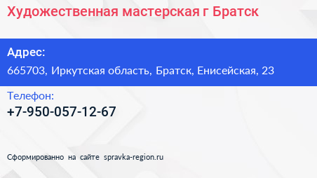Художественная мастерская, г. Братск по адресу 665703, Иркутская область, Братск, Енисейская, 23 в дальнейшем Организация, размещена в следующих категориях: