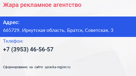 Жара, рекламное агентство по адресу 665729, Иркутская область, Братск, Советская, 3 в дальнейшем Организация, размещена в следующих категориях: