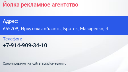 Йолка, рекламное агентство по адресу 665709, Иркутская область, Братск, Макаренко, 4 в дальнейшем Организация, размещена в следующих категориях: