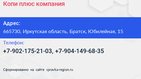 Копи плюс, компания по адресу 665730, Иркутская область, Братск, Юбилейная, 15 в дальнейшем Организация, размещена в следующих категориях: