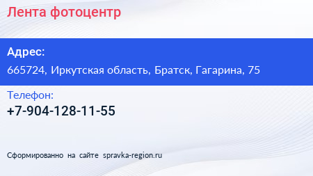 Лента, фотоцентр по адресу 665724, Иркутская область, Братск, Гагарина, 75 в дальнейшем Организация, размещена в следующих категориях: